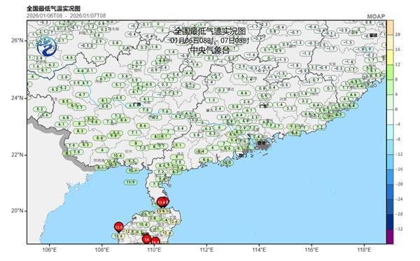 即使在广西、广东、福建东部沿海,早晨最低气温也只有个位数,连海南的最低气温也只有10℃出头。
